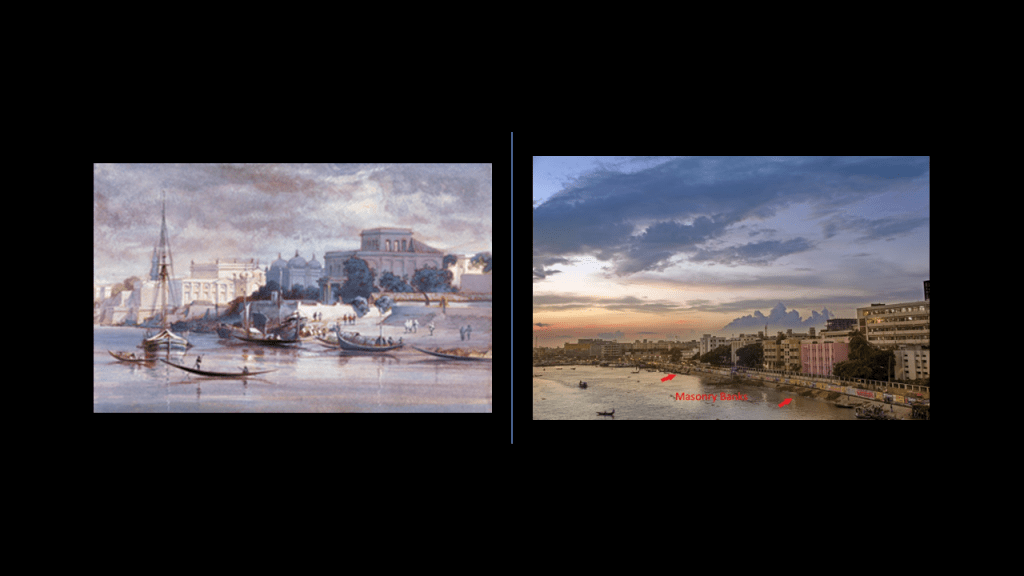 This was a view of Dhaka from across the Buriganga River, said to have been painted in 1861 on the left, and on the right, Dhaka across the Buriganga River today.
