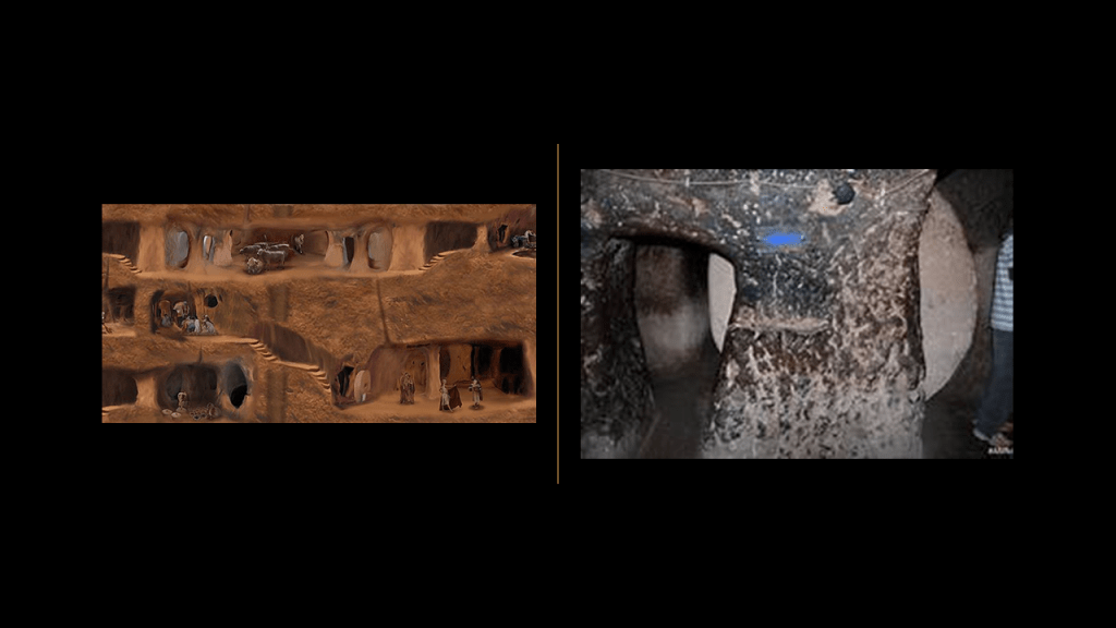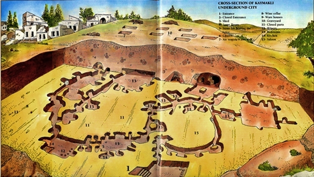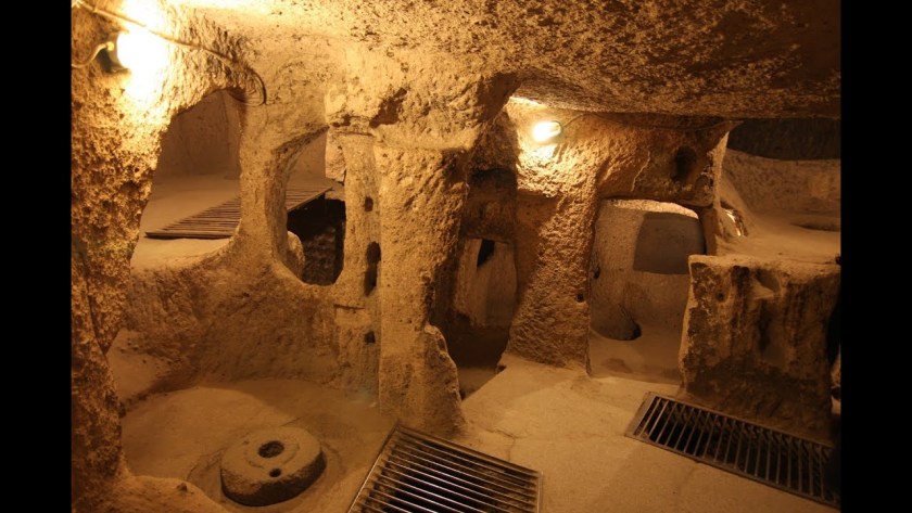 …the underground city of Ozkonak, discovered in 1972, which had a water well, pipe communication system, winery, and moving stone doors…