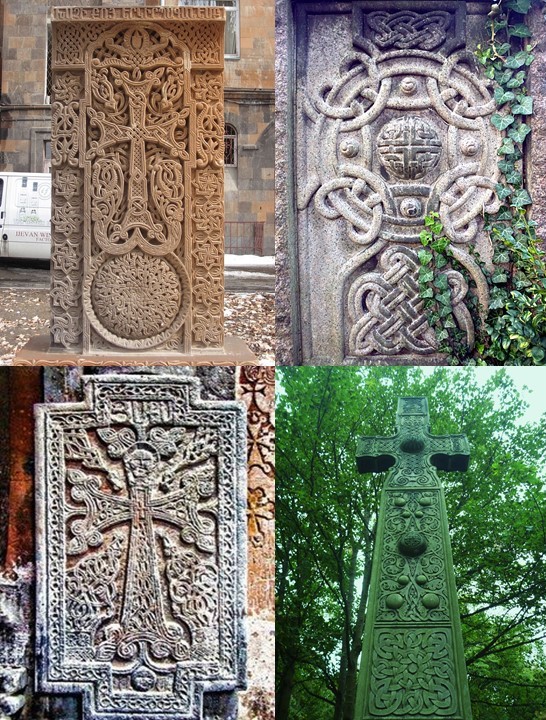 The two photographs on the left show Armenian stone crosses, and on the right are two stone crosses found along the River Leith in Edinburgh, Scotland. Not identical, but similar stylizations.