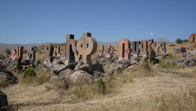 We are told that the Armenian alphabet was carved in stone in 2005 by Armenian architect Jim Torosyan in Artashavan, Armenia, on the eastern slope of Mt. Aragats, on the northern end of the Ararat Plain, near Mashtot’s final resting place to celebrate the 1,600th-anniversary of its creation.