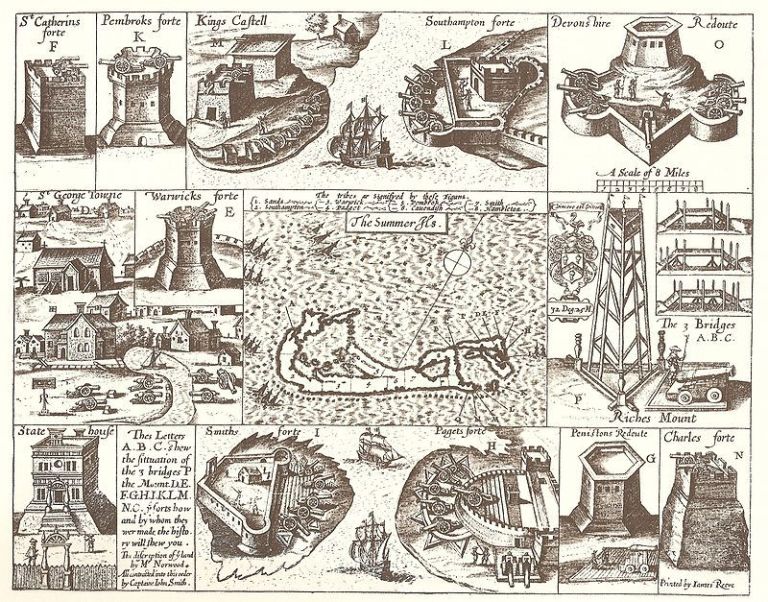 This is a 1624 map depicting numerous star fort looking structures that were found at one time throughout Bermuda, and said to have been made by Captain John Smith of Pocahontas and Virginia fame in our historical narrative.