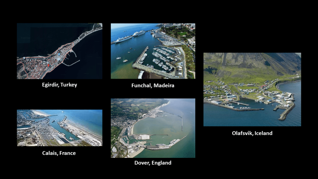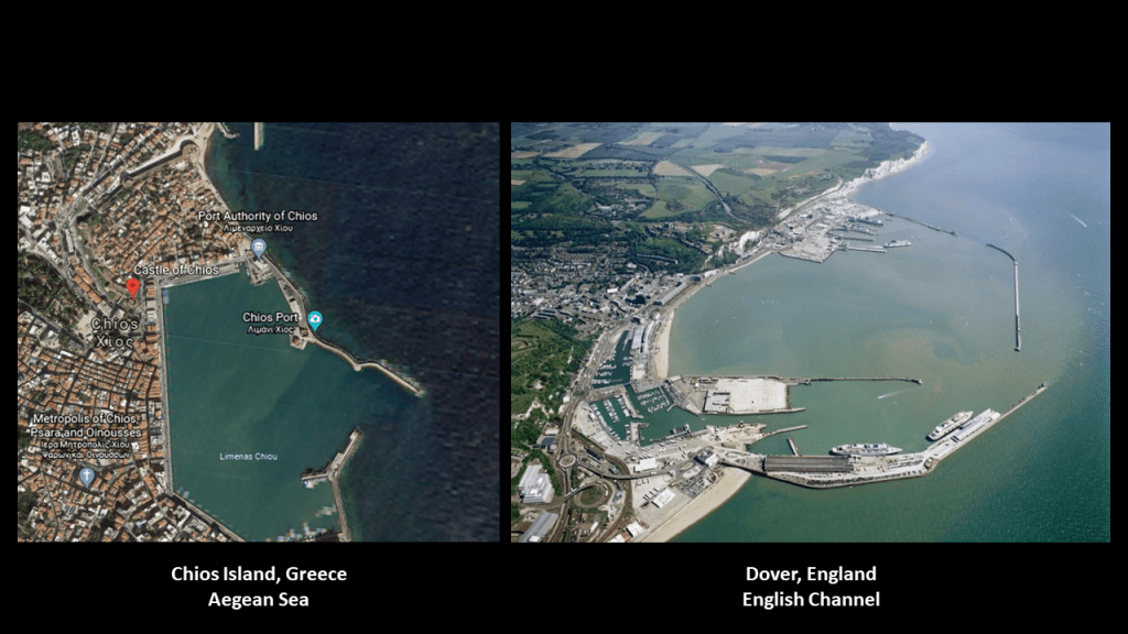 …next to what looks like an artificially made port facility at Chios, with its straight lines and angles, like we saw in an earlier example at Egidir in Turkey compared with other places in the world, like Dover on the English Channel on the right.