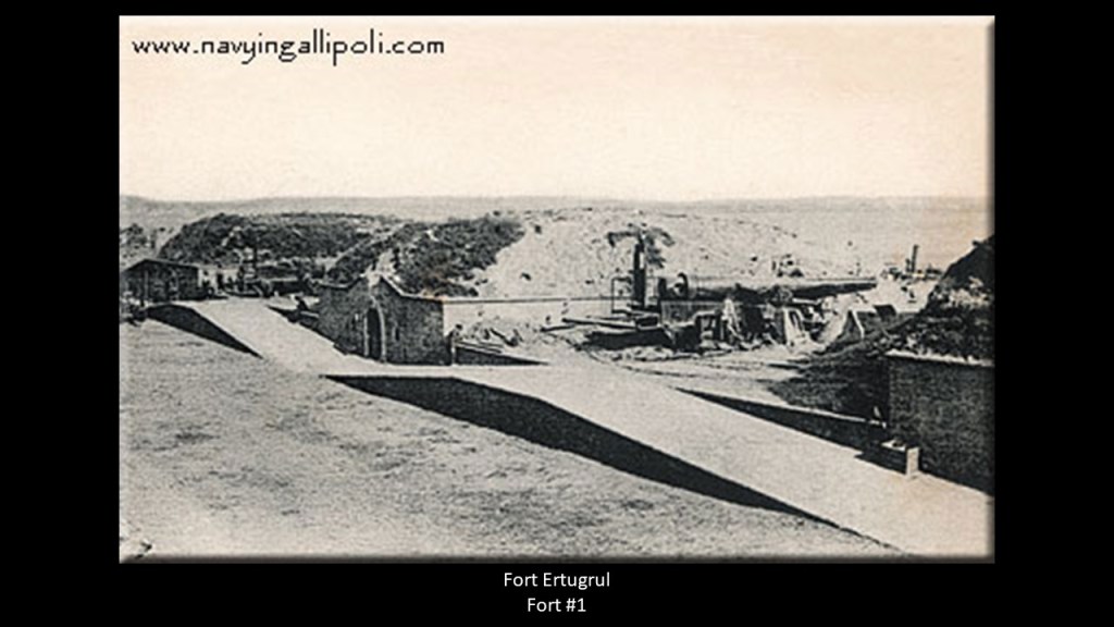 The Royal Navy bombarded the Sedd-el-Bahr, also known as Fort #3, along with Fort Ertugrul, known as Fort #1 on the other side of “V Beach.”