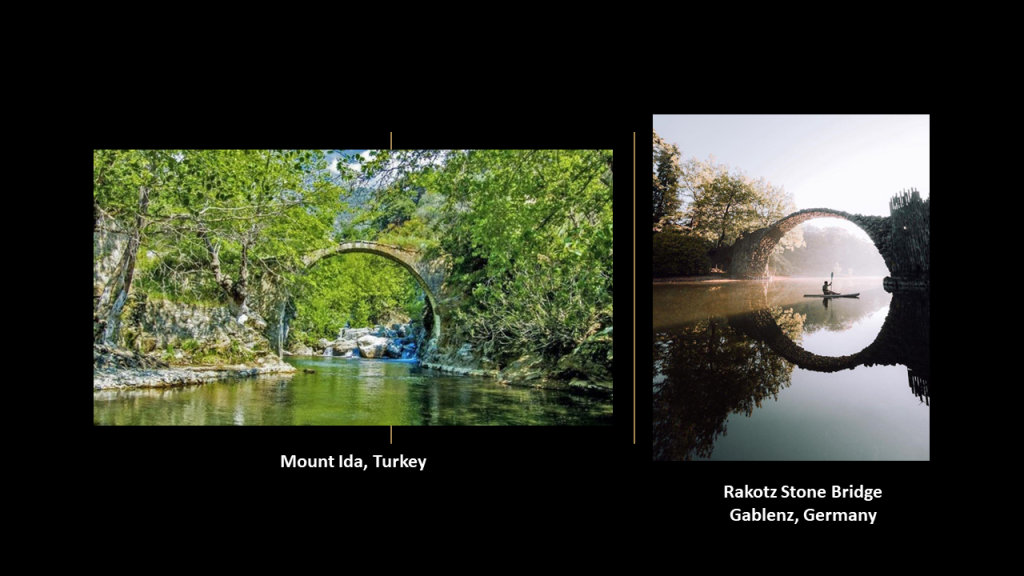 I found this old stone bridge in the Mount Ida region in Turkey on the left that looks similar to the Rakotz stone bridge in Gablenz, Germany.