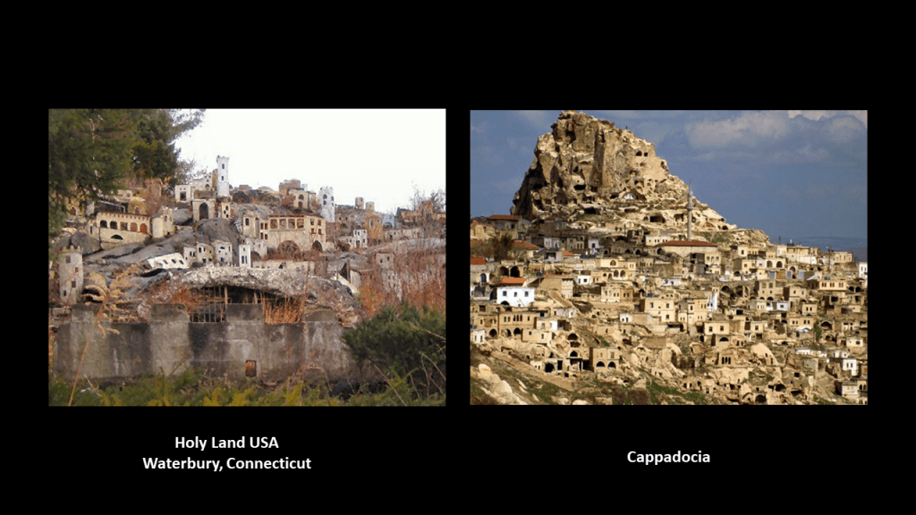 Waterbury in Connecticut was the location of Holy Land USA on the left, which we are told was a theme park inspired by passages from the Bible that opened in 1955 and closed in 1985 and today the location is in an advanced state of disrepair.
