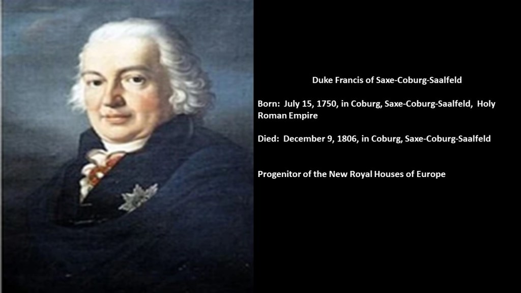 Then, Francis, Duke of Saxe-Coburg-Saalfeld, was born on July 15th of 1750, and was the progenitor of the House of Saxe-Coburg and Gotha line, which seeded the lineage of the new royals, primarily through first cousins Queen Victoria and Prince Albert, but also through direct marriage of this obscure ducal line marrying directly into other European Royal families.