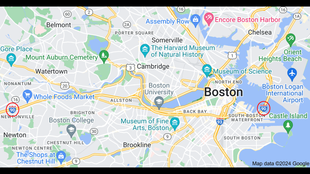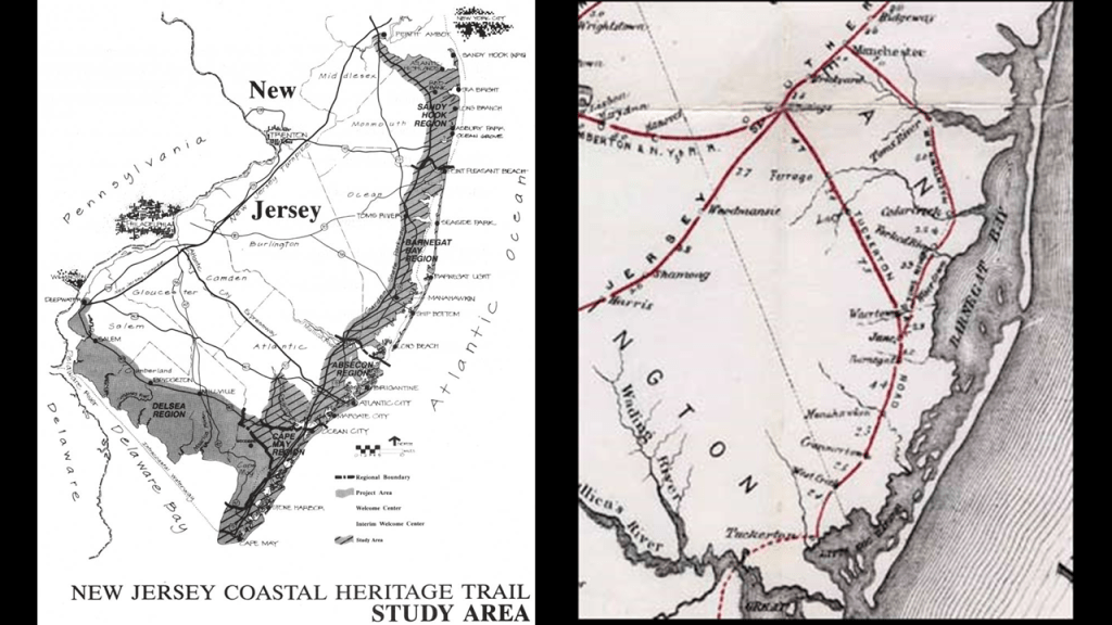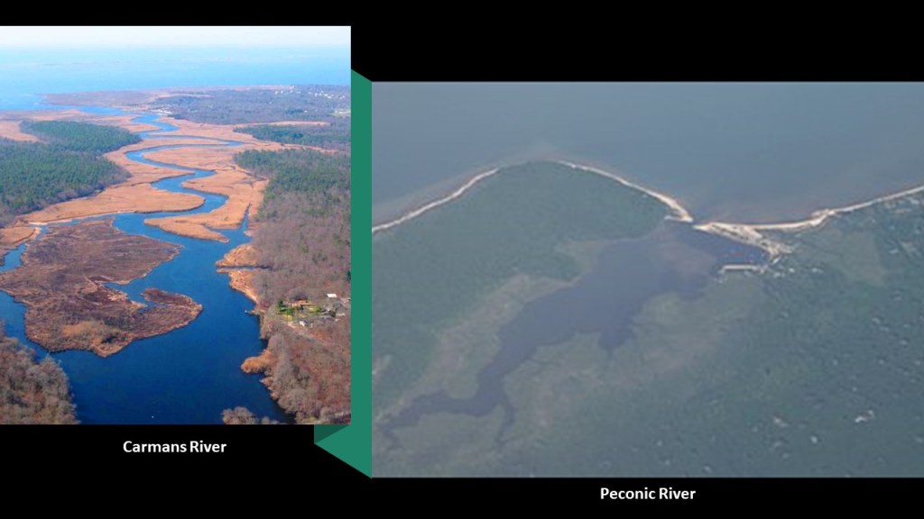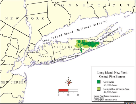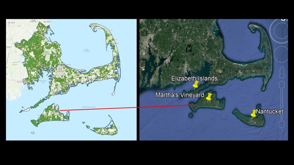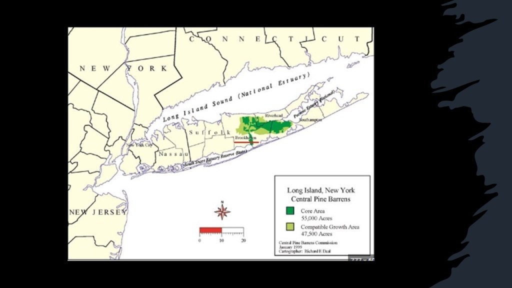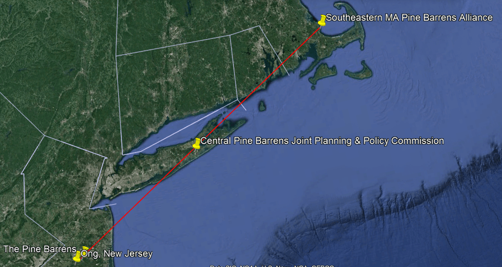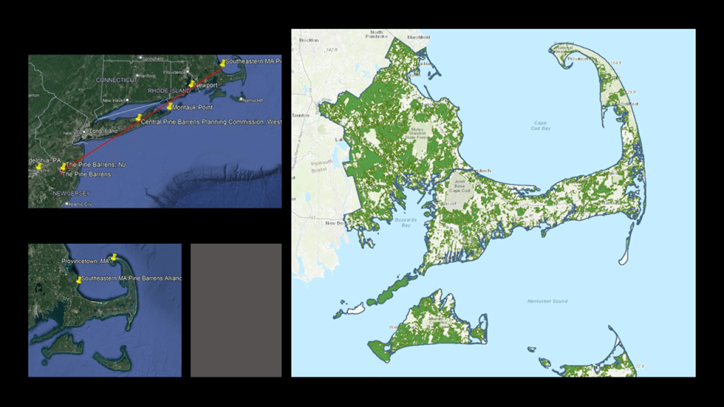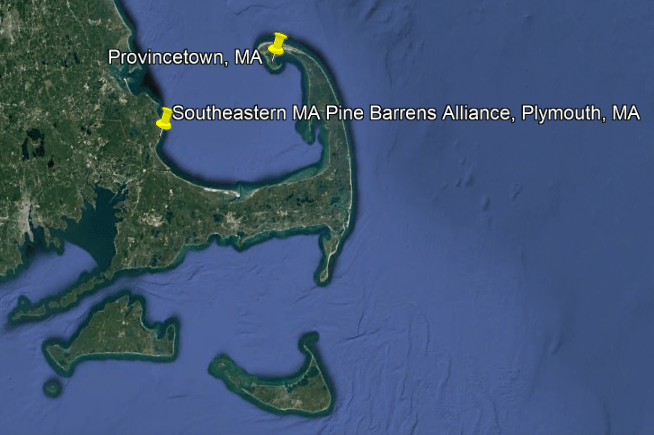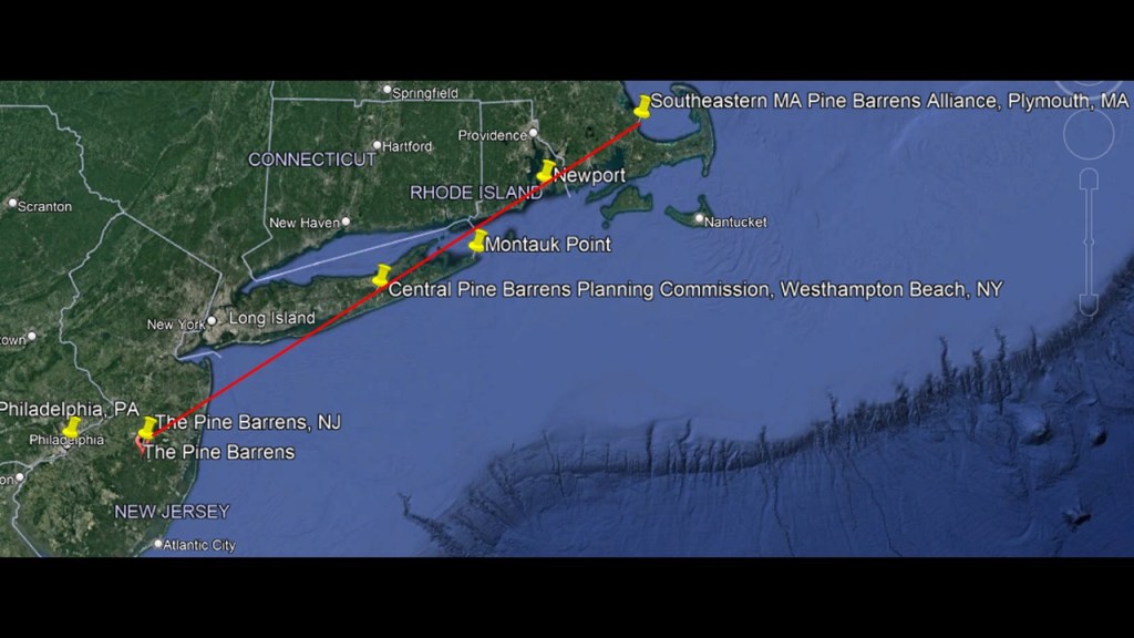 Provincetown at the bottom left, at the tip of Cape Cod where the Pilgrim Monument is located, is also on the alignment and all of Cape Cod, as well as the Elizabeth Islands, Martha’s Vineyard, and Nantucket, is part of the Southeastern Massachusetts Pine Barrens Alliance, on the right.