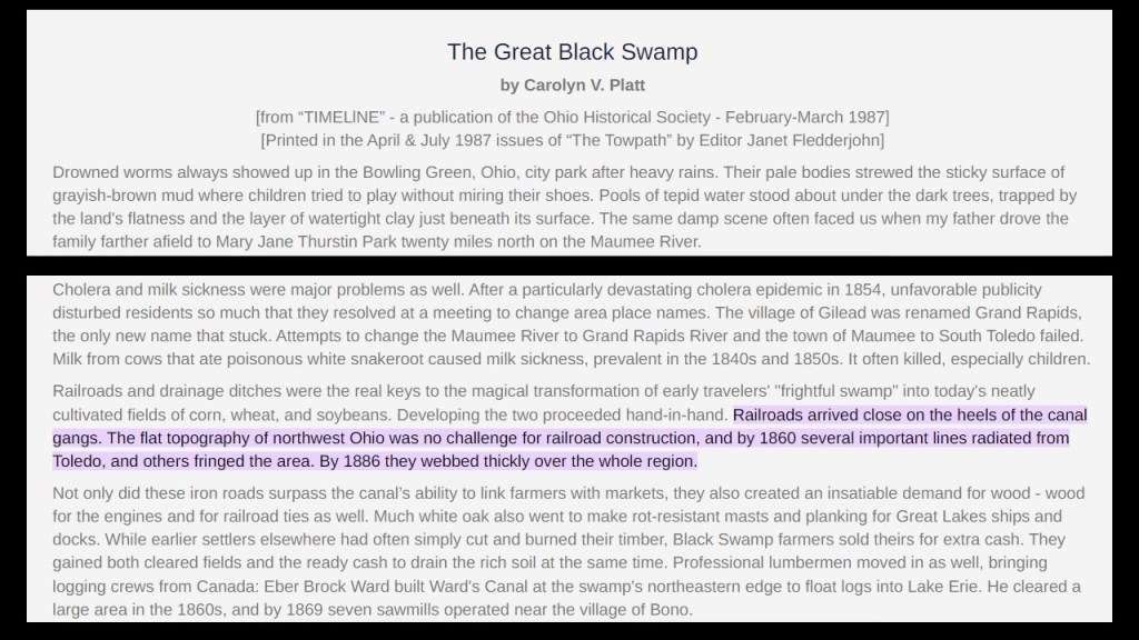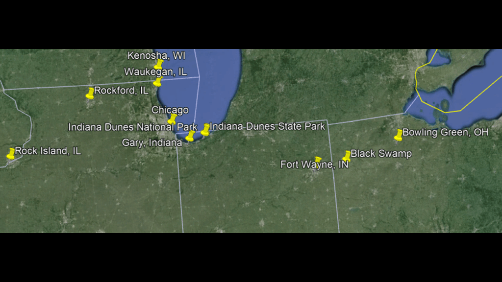 Interestingly, I found out that the “American Discovery Trail” includes the Indiana Dunes Discovery Trail on the Southern Shore of Lake Michigan, which is called one of the most biodiverse areas in the United States, and includes sand dunes and wetlands, including bogs, existing right next to each other in the same location, and both are beside railroad tracks, circled on the bottom right.