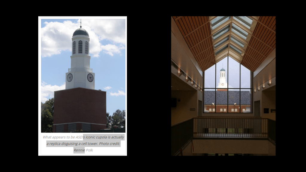…and we are told that a replica of the cupola of the original building is now a cell tower on the school’s grounds.