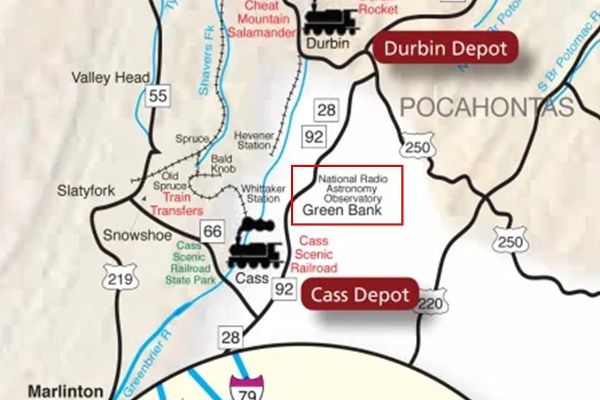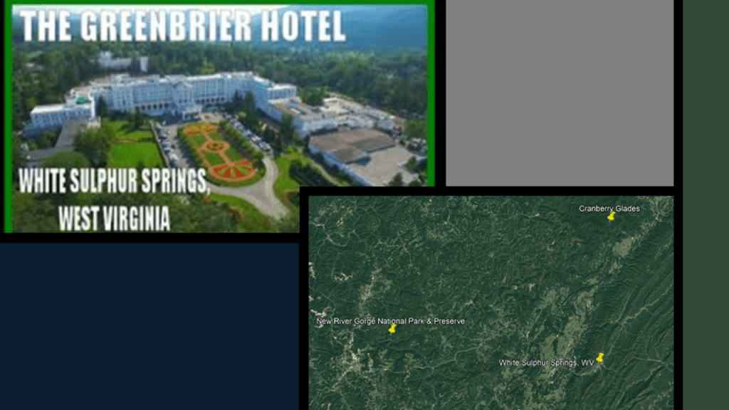 Besides the nearby Green Bank Telescope, there’s also the Sugar Creek Naval Radio Station in the National Radio Quiet Zone, as well as White Sulphur Springs.