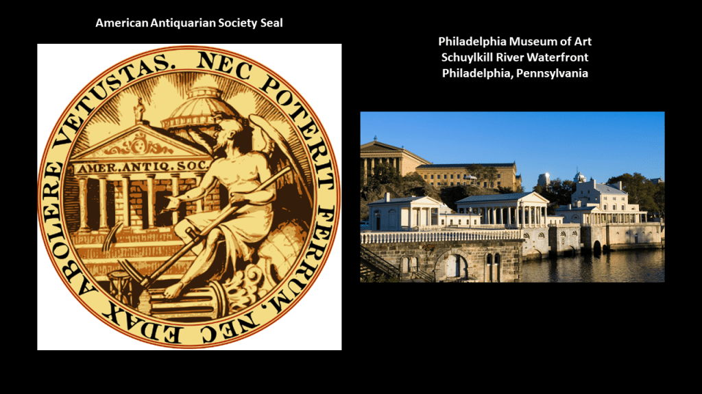 The seal of the American Antiquarian Society translates from the Latin of Ovid’s Metamorphoses, Book 15, Line 872: “Now I have completed my work, which neither sword nor devouring Time will be able to destroy” complete with an illustration of what we have come to consider Greco-Roman architecture and a broken corinthian pillar at the feet of what appears to be an angel.