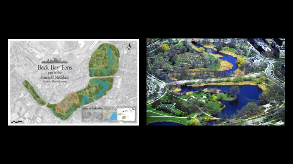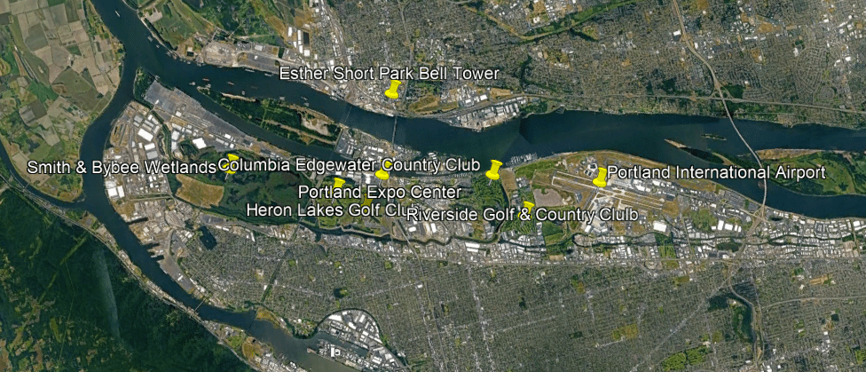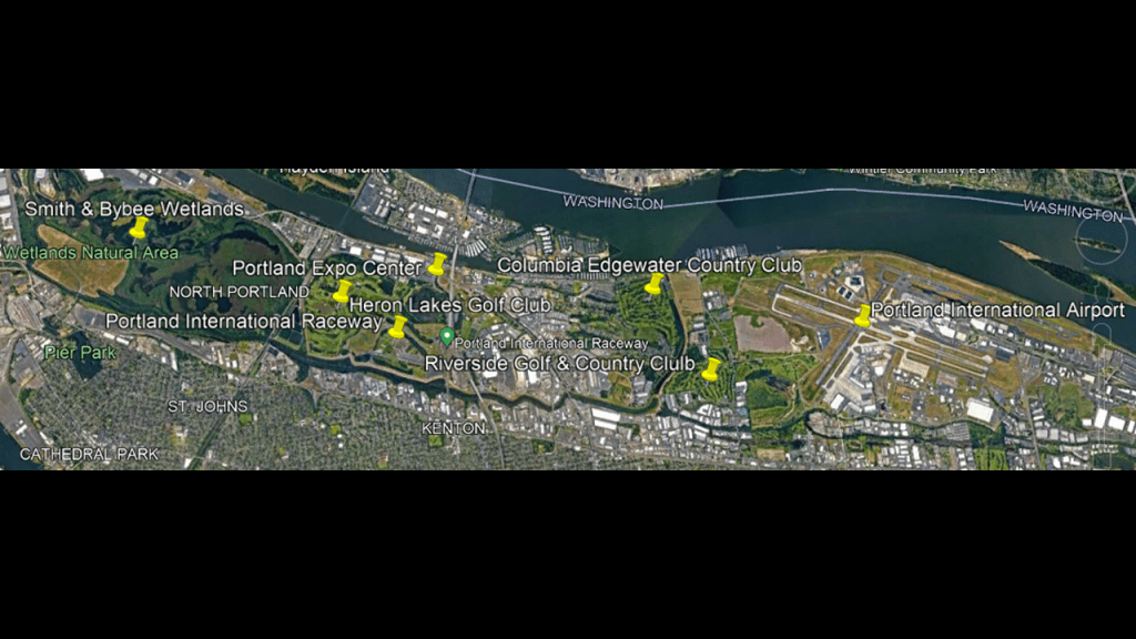 Both locations have s-shaped river bends and airports nearby, with the name of the parks notated by an oval; the airports by a box; and the river bends are pointed at by arrows.