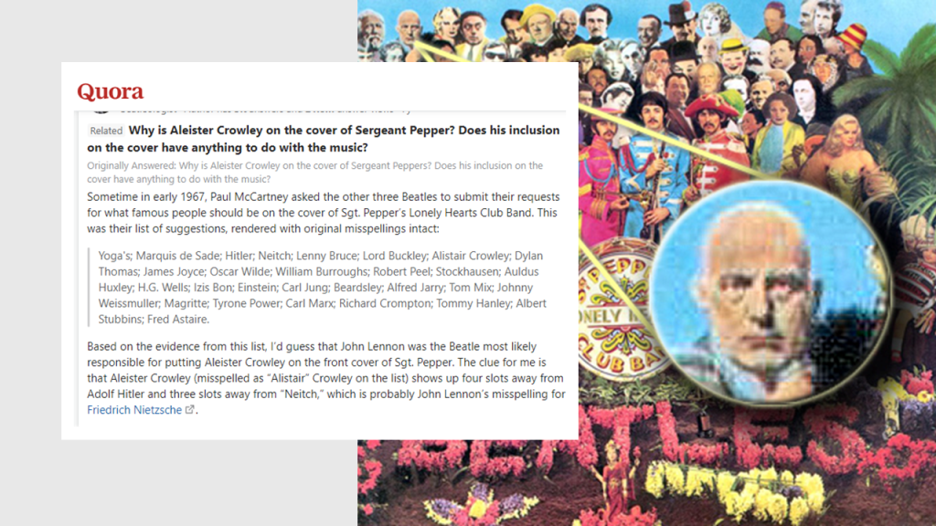 What was interesting is that when I searched for “Was Billy Shears Aleister Crowley’s son?,” what came up was the Crowley was one of the figures depicted in the background on the album cover of “Sergeant Pepper’s Lonely Hearts Club Band.”