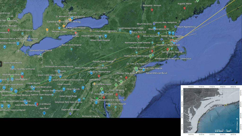 As one example, he sent me this screenshot of a convergence of leylines he found at a location on the Northeastern United States Continental Shelf in the Atlantic Ocean off the coast of Massachusetts.