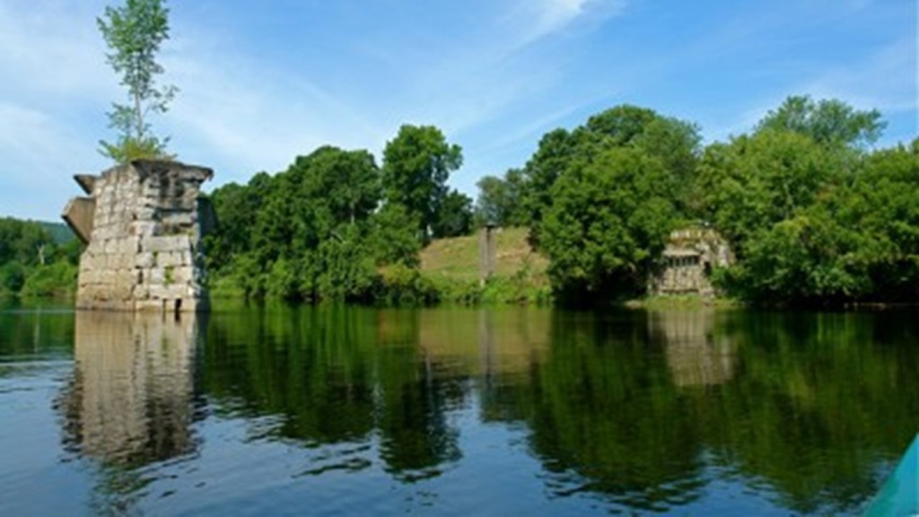 All that remains are the stone piers of the bridge in the Connecticut River.