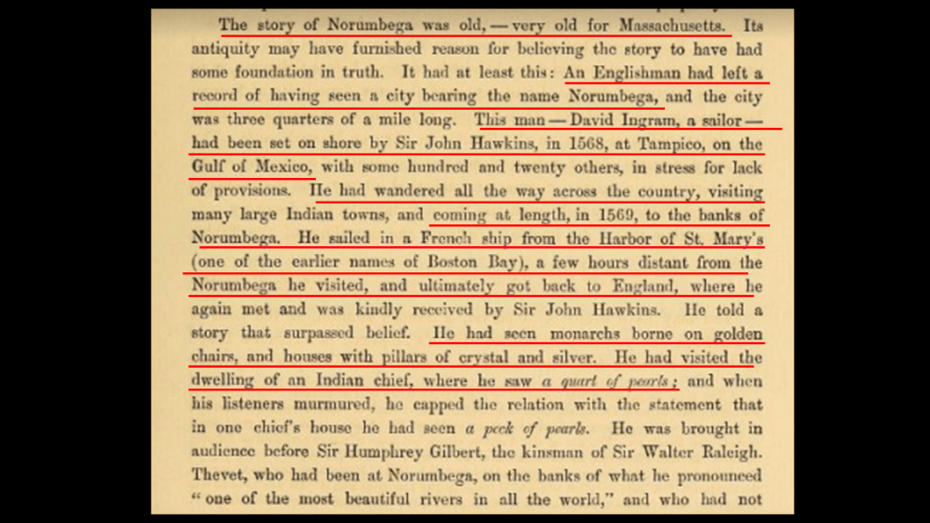 So here Norumbega in North America was described as a opulent place of wealth and abundance, even mentioning visiting the home of an “indian” chief, he saw a quart of pearls.
