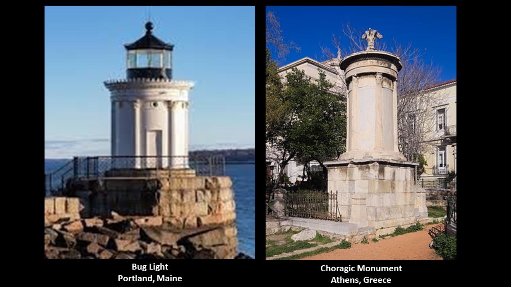 The present Portland Breakwater Light, also known as the Bug Light, was said to have been built in 1875 to resemble a 4th-century Greek monument called the Choragic Monument of Lysicrates in Athens.