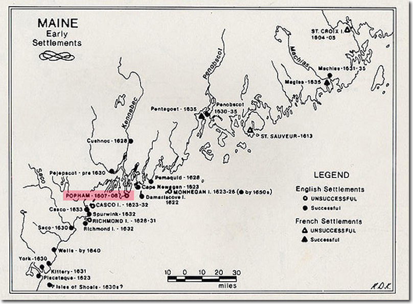 The Plymouth Company, officially known as the Virginia Company of Plymouth, established the Popham Colony near the mouth of the Kennebec River in present-day Phippsburg, Maine in 1607, a few months after the establishment of Jamestown.