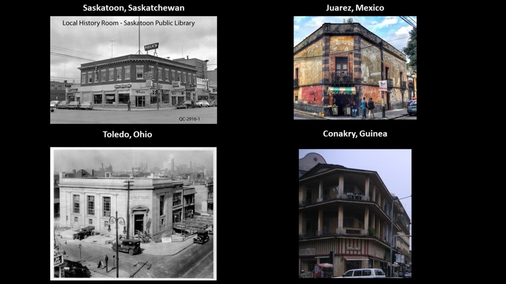 And there is more of the same corner architecture and layout in Saskatoon like we saw back in Edmonton, and that is seen worldwide, like at the historical photo of the Local History Room of the Saskatoon Public Library on the top left; and the buildings in Juarez, Mexico, on the top right; in Toledo, Ohio, on the bottom left; and in Conakry, in the west African country of Guinea on the bottom right.