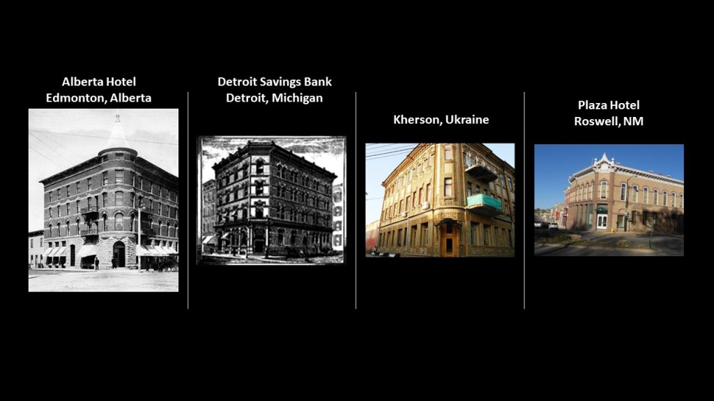 And here on the left is the Alberta Hotel, compared with the Detroit Savings Bank on the left middle; a building on Kherson, Ukraine on the middle right; and the Plaza Hotel in Roswell, NM, on the right.