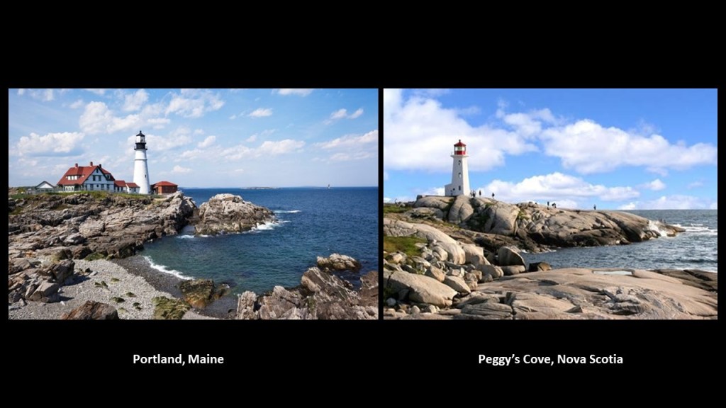 This is a comparision of the Portland Head Light on the left, and Peggy’s Cove in Nova Scotia on the right.