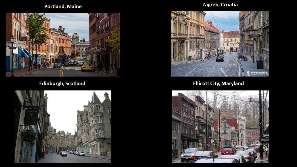 Here is a street view of Portland on top, compared with a very familiar look to me from other cities in very different places – bottom left is Edinburgh, Scotland; middle is from Zagreb, Croatia; and on the bottom right is Ellicott City, Maryland.