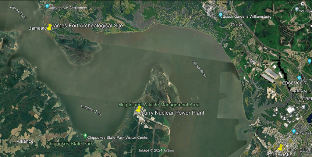 The Surry Nuclear Power Plant on the Hog Island Wildlife Management Area, and Fort Eustis, the headquarters of the U. S. Army’s Training and Doctrine Command which overseas training of forces and the development of operational doctrine, are to the southeast of the James Fort Archeological Site.