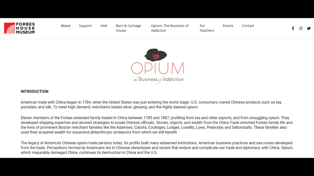 The Forbes family’s original fortune came largely from trading opium and tea between North America and China in the 19th-century.