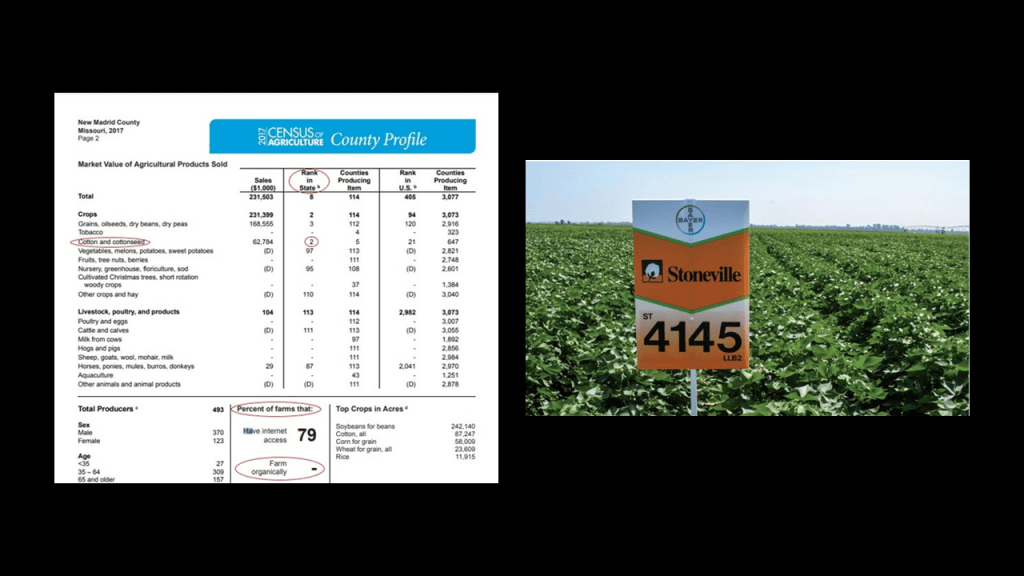 Today, New Madrid is the second-leading producer of cotton in the State of Missouri, and the percentage of organic farming in New Madrid County indicates none.