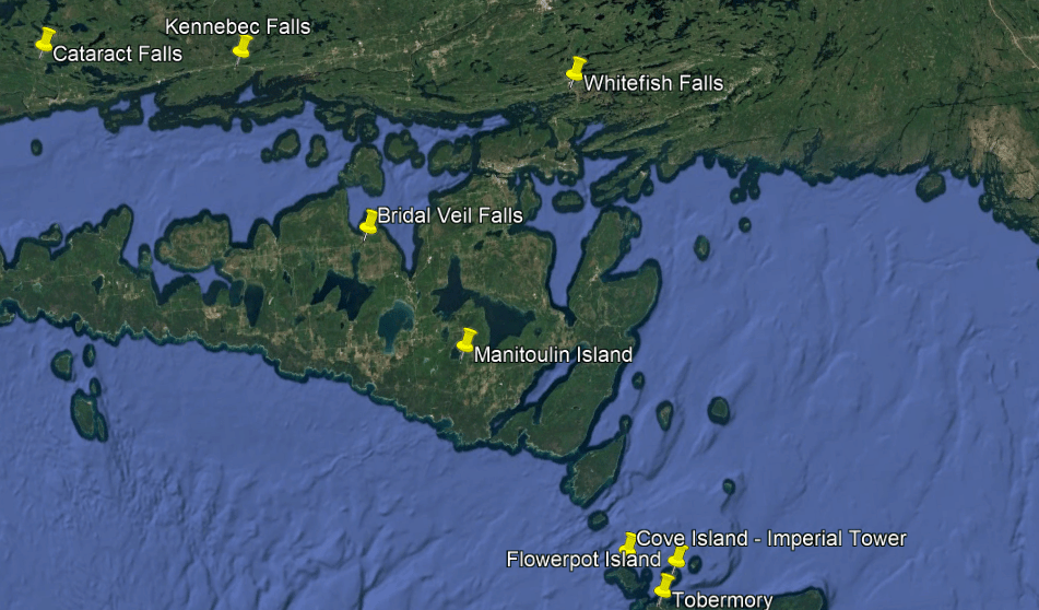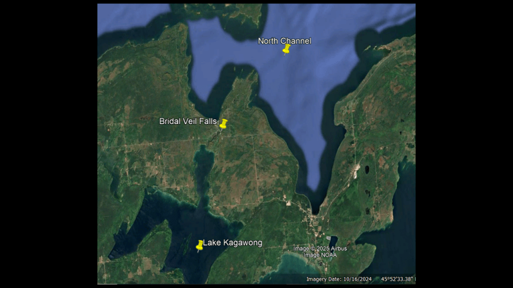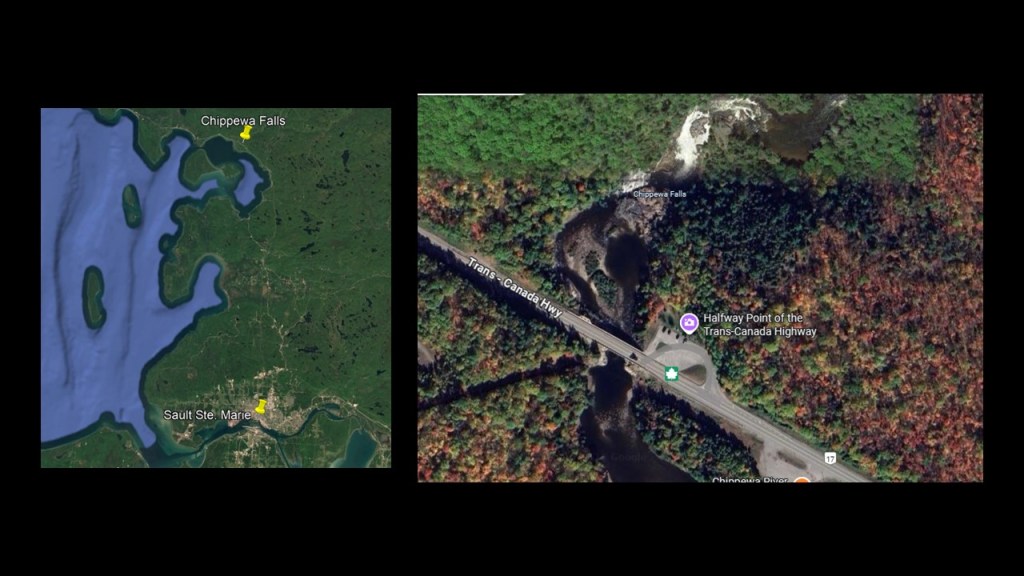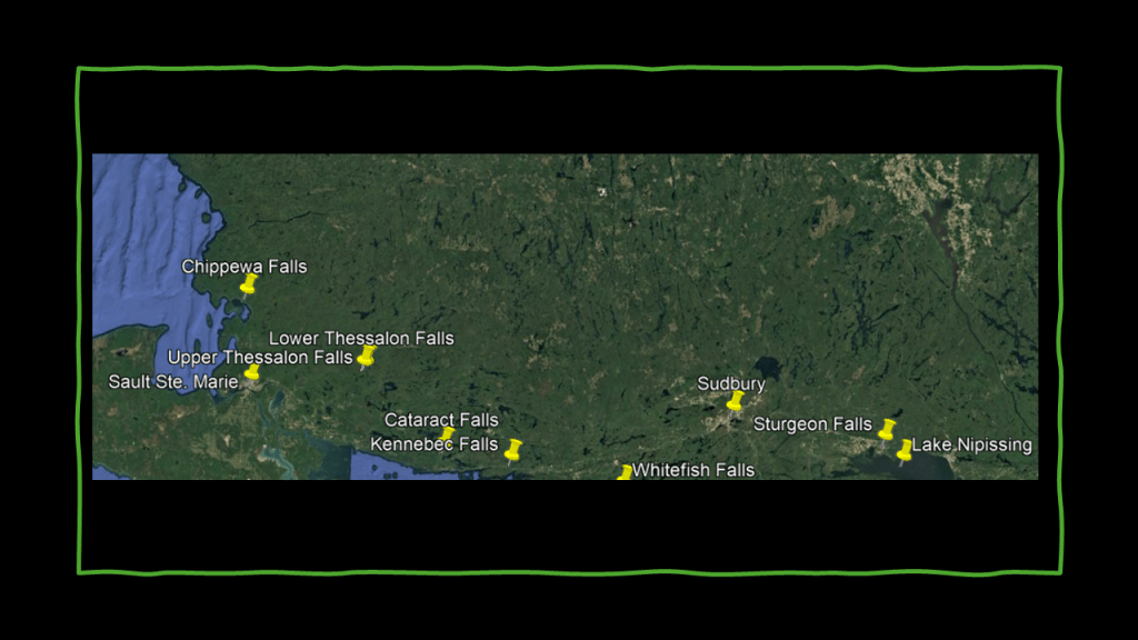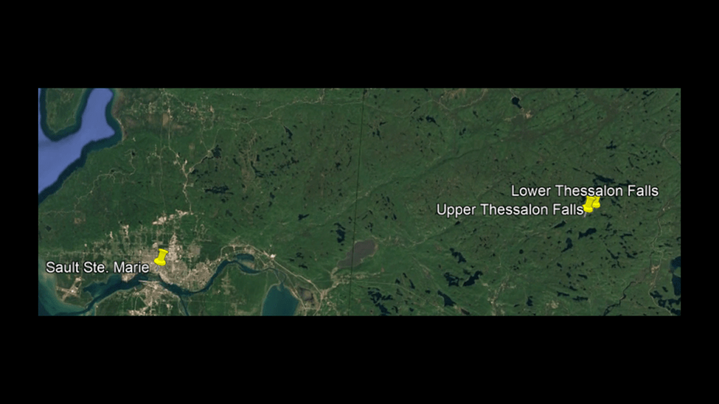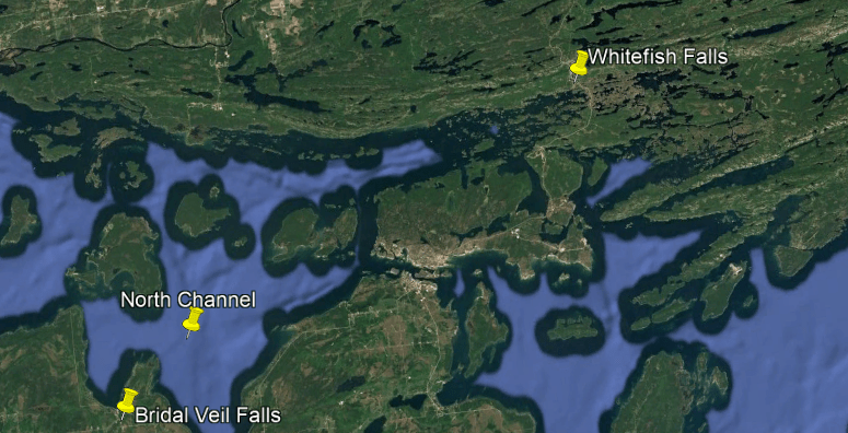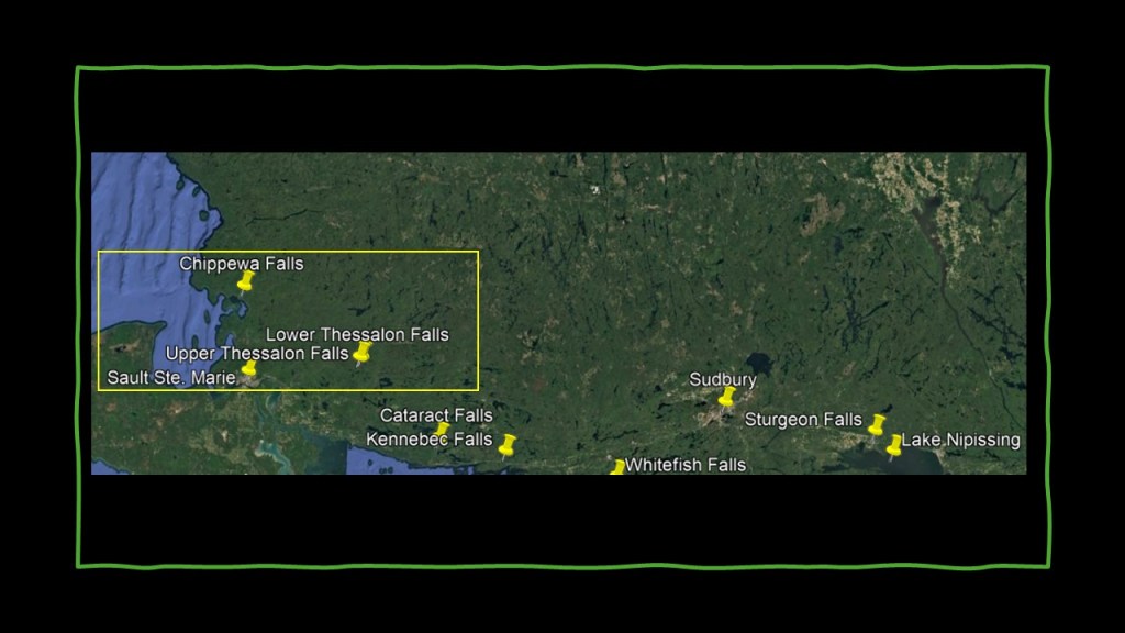 On the west-side of the screenshot, we have Chippewa Falls, Upper and Lower Thessalon Falls, and Sault Ste. Marie.