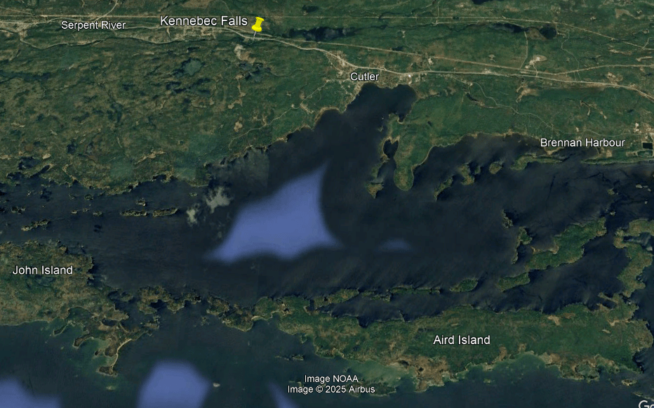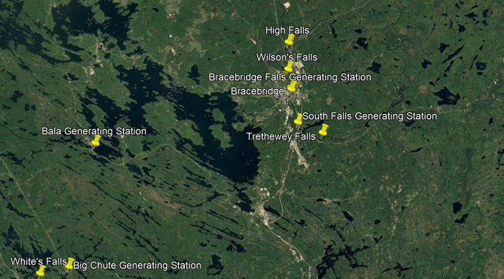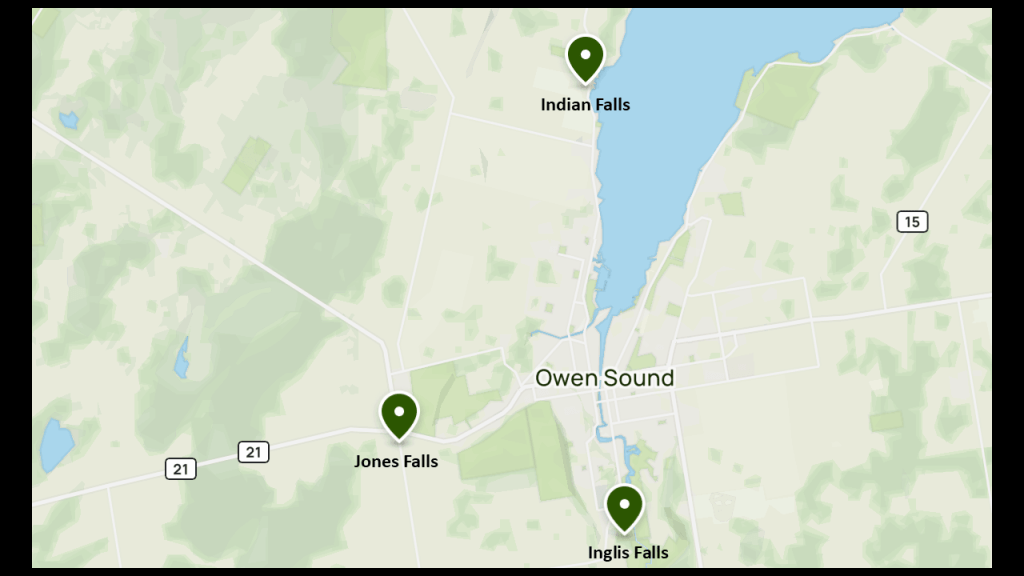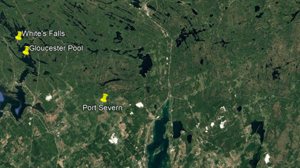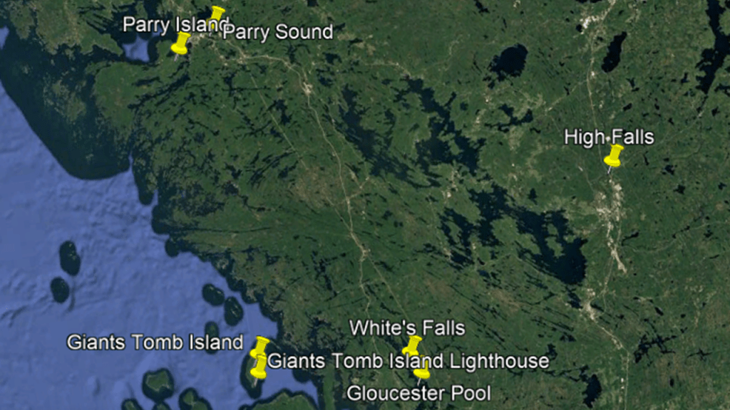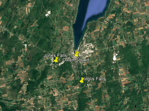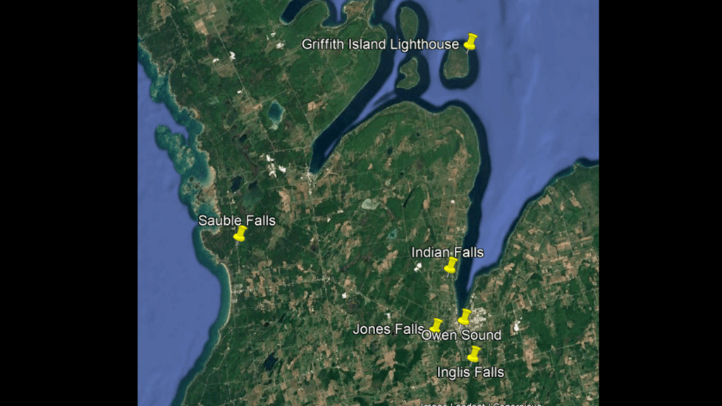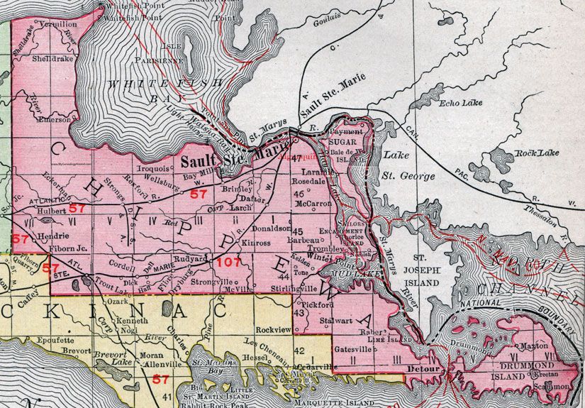 On the west-side of the screenshot, we have Chippewa Falls, Upper and Lower Thessalon Falls, and Sault Ste. Marie.