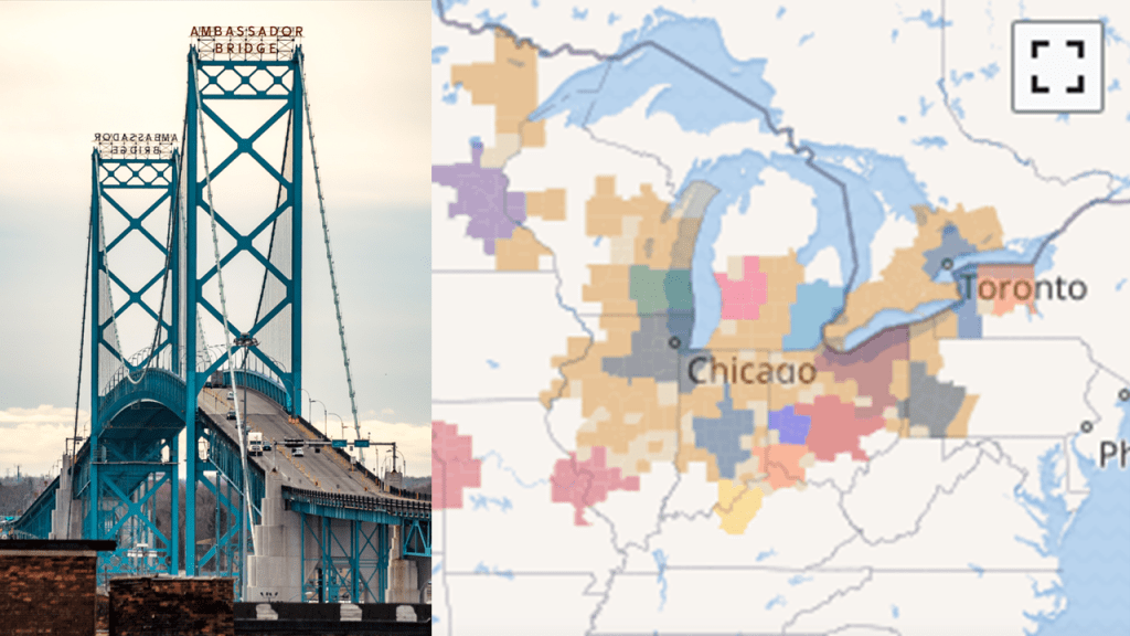 The busiest commercial crossing on the International Border between the United States and Canada, the Ambassador Bridge between Windsor and Detroit links what is called the “Great Lakes Megalopolis,” a region which runs roughly-speaking west from Minneapolis – St. Paul in Minnesota, and south to St. Louis, Missouri and Louisville in Kentucky, and east to Rochester in New York, and northeasterly to Quebec City.