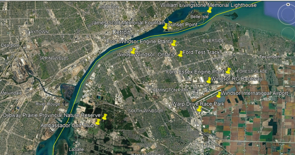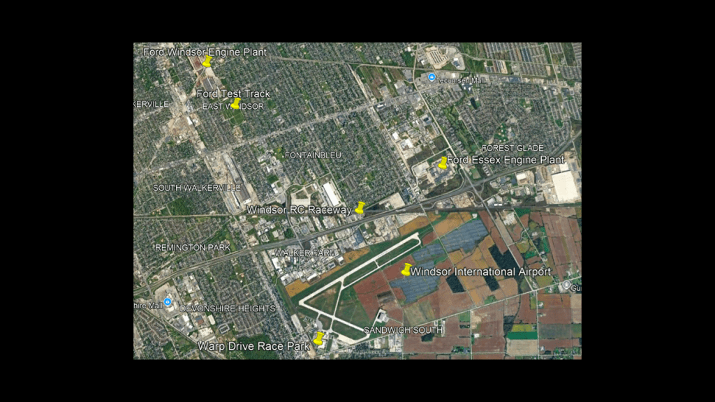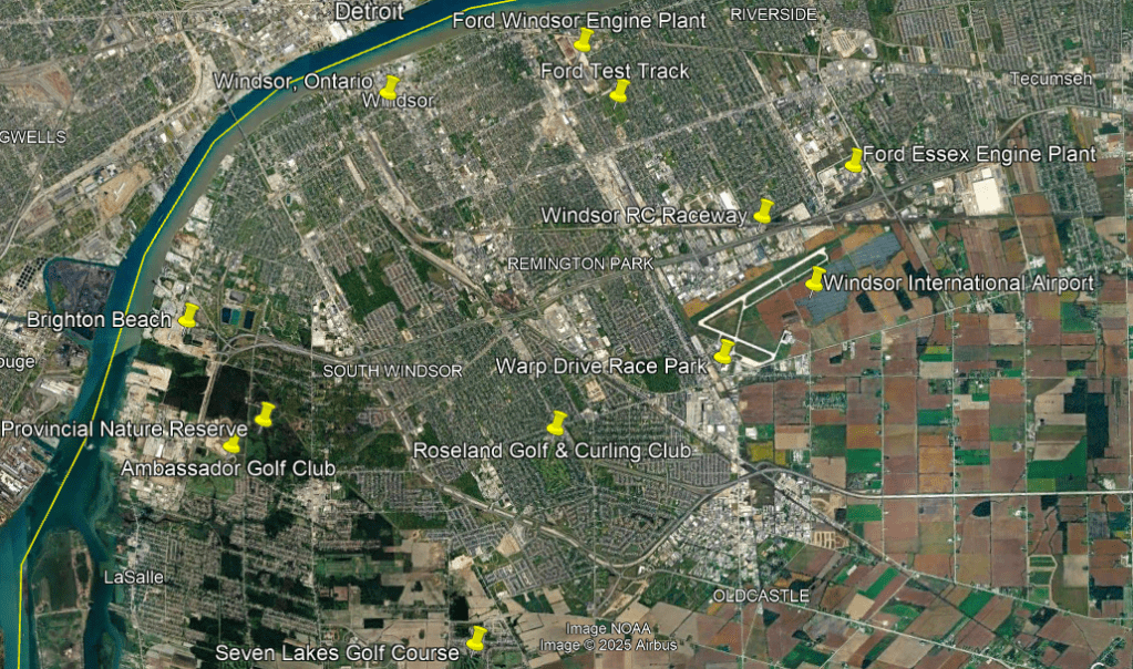 Heading in an easterly direction from the Brighton Beach location, we come to more golf courses like the Seven Lakes Golf Club and the Roseland Golf and Curling Club; more tracks, like the Warp Drive Race Park, the Windsor RC Raceway, and the Ford Test Track; the Ford Windsor Engine Plant; the Ford Essex Engine Plant; and the Windsor International Airport.
