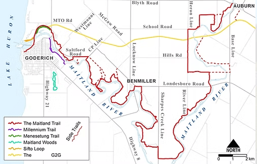 On west-side of it, we have Chippewa Falls, Upper and Lower Thessalon Falls, and Sault Ste. Marie.