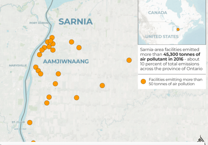 It is described as an integrated Liquified Petroleum (LPG) storage facility for propane and butane with nine underground storage caverns in a salt bed 1200- to 1500-feet, or 366- to 457-meters, below the surface, with five brine ponds and there is a pipeline that goes underneath the Detroit River connecting it to Michigan.