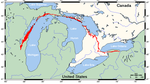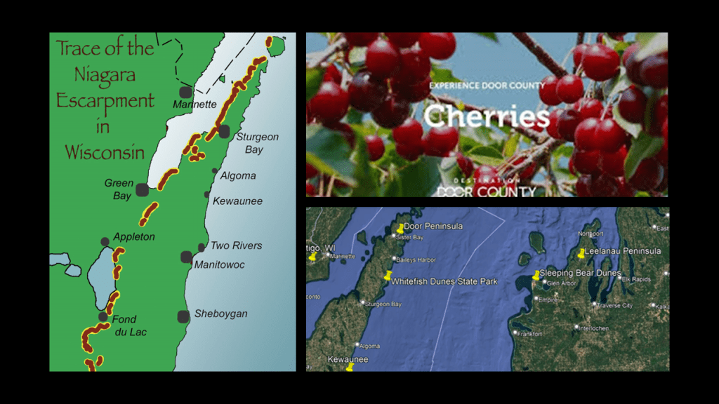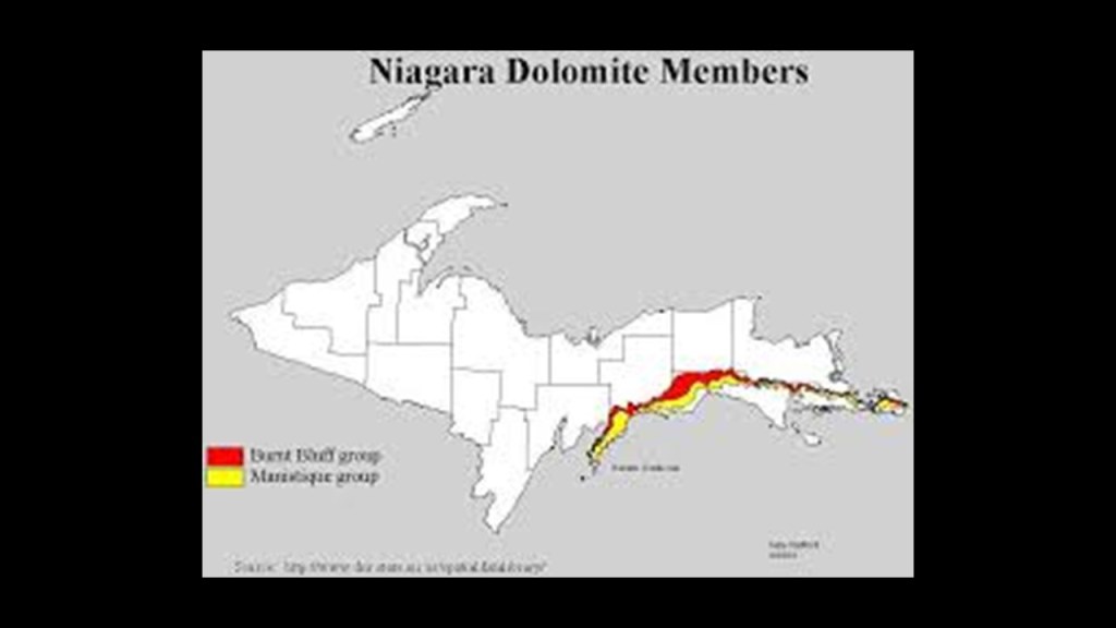 The Niagara Escarpment runs predominantly east-to-west, from New York, through Ontario, Michigan, Illinois, and Wisconsin, with a nice, half-circle shape, attached to a straight-line, when drawn on a map.