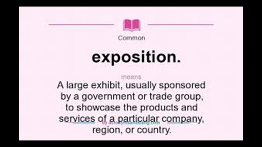 What better way to tell your audience the story you want them to believe than the other definition of exposition, a large exhibition of art or trade goods, which would include settings like museums.