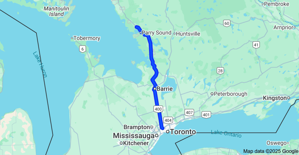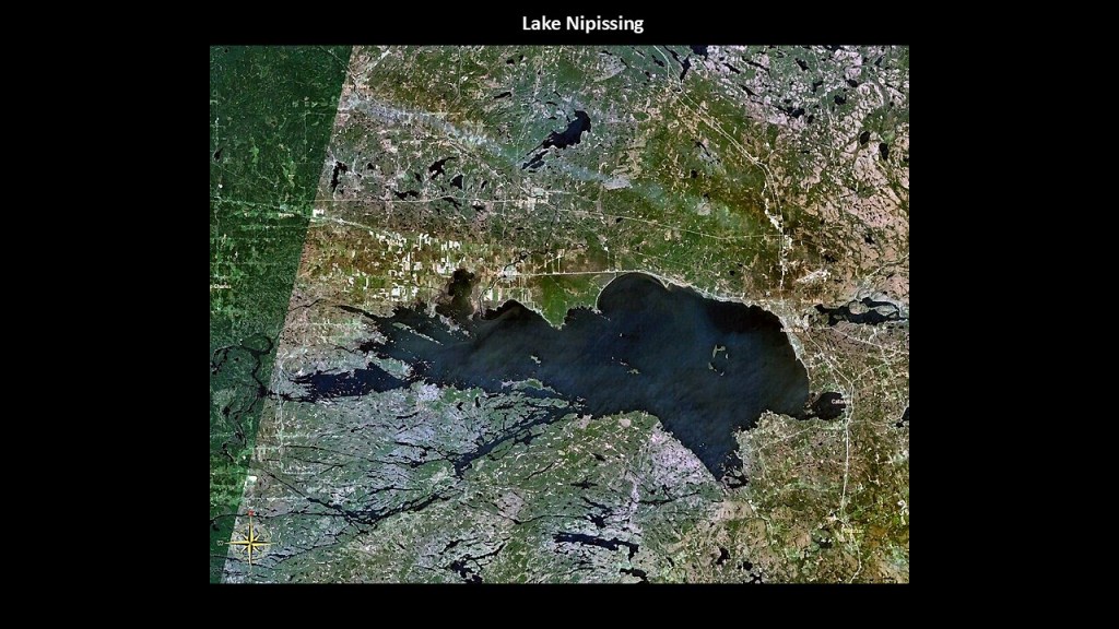 As we zoom out on the bigger picture of this part of what is considered northern Ontario, and north of where we were just looking, on the east-side of the Google Earth screenshot, we have Sudbury, Sturgeon Falls, and Lake Nipissing.