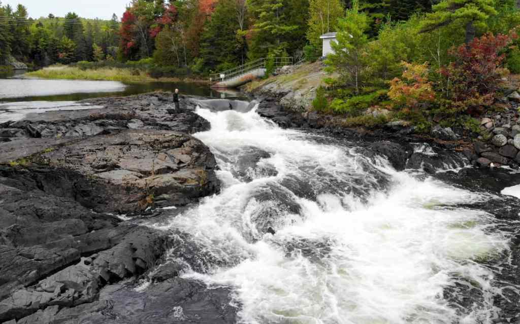 At the location of the Lower Thessalon Falls, the river drops about 26-feet, or 8-meters, in two distinct parts, before the river turns 45-degrees to the left, and drops down a steeper slide into a narrow gorge.