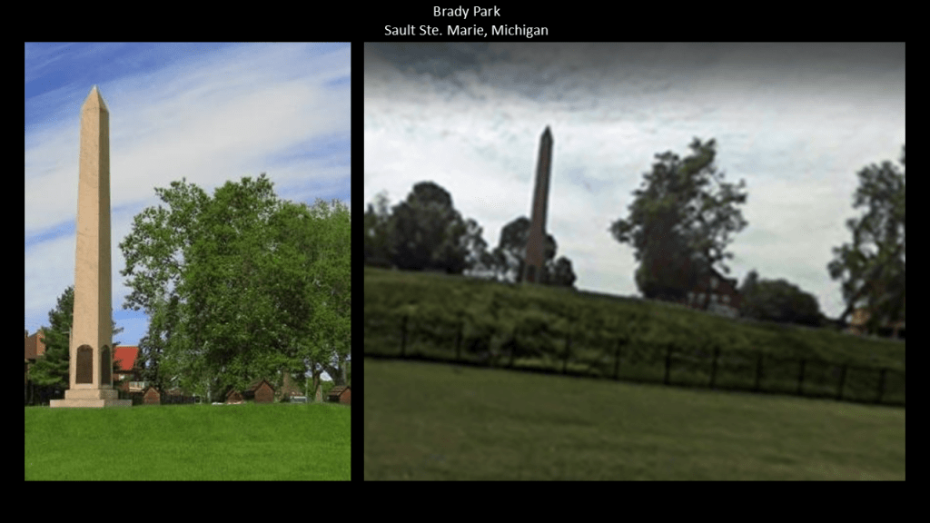 What is Brady Park today is located on the grounds of the Old Fort Brady. …Here we find an obelisk said to have been designed by Charles McKim, of what is called the renowned New York architecture firm McKim, Mead, and White, to commemorate the 50th-Anniversary of the Soo Locks…This obelisk is situated on top of a triangular-looking earthwork, as seen here from Google Earth streetview.