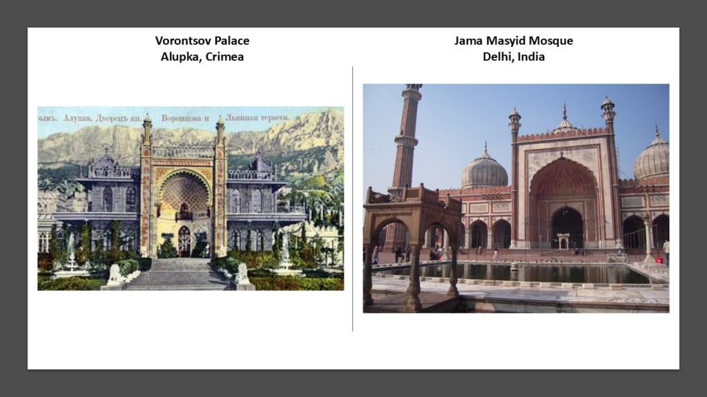 Here is a comparison of the some of the architecture found at Vorontsov Palace in the Crimea on the left, and on the right, the Jama Masyid Mosque in Delhi, India, said to have been built by the Mughal Emperor Shah Jahan between 1650 and 1656.