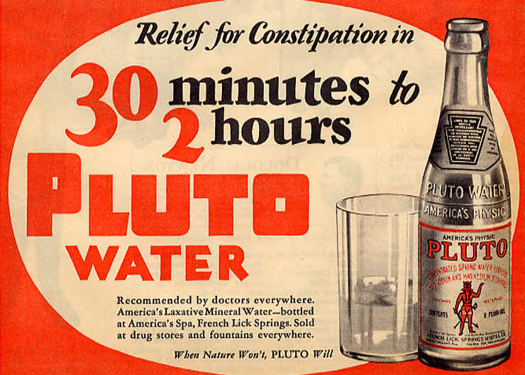 “Pluto Water” was a heavily-mineralized laxative water renowned for its natural magnesium and sodium sulfate content, and was shipped nationwide until 1971, when we are told it was discovered to have lithium in it and subsequently sales were stopped.