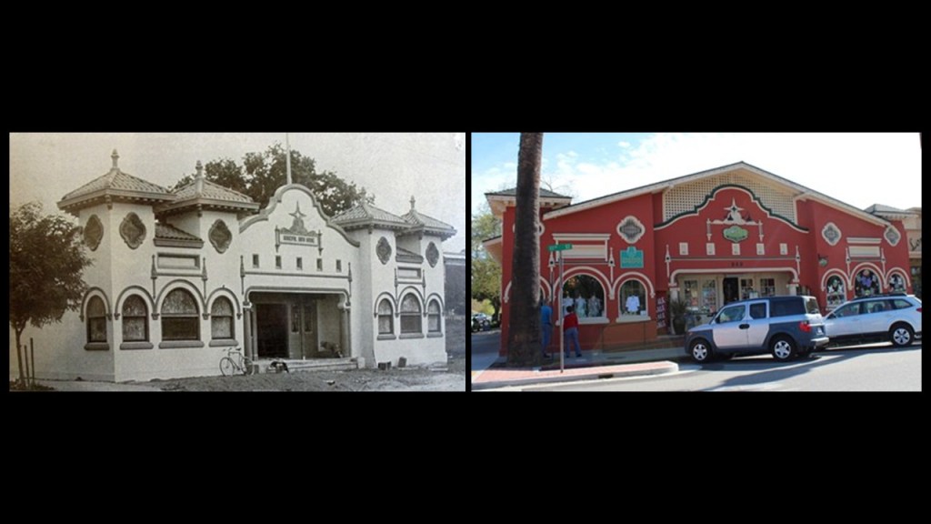 This is a photo of the municipal mud bath in 1905 on the left, and on the right, the candy store that is at the same location today, with no more mud baths!