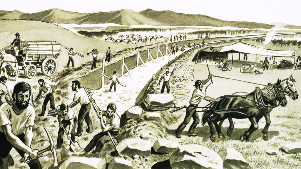 Previous Image Next Image At work on the Erie Canal Immigrant Irish “navvies” (as in navigator) excavated the Erie Canal by hand. (“At Work on the Erie Canal” (English School, 20th century)/Private Collection/Look and Learn/Bridgeman Images