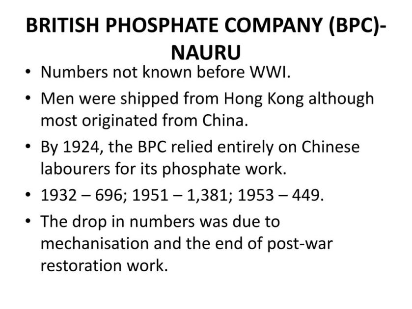 Numbers not known before WWI. Men were shipped from Hong Kong although most originated from China. By 1924, the BPC relied entirely on Chinese labourers for its phosphate work – 696; 1951 – 1,381; 1953 – 449. The drop in numbers was due to mechanisation and the end of post-war restoration work.