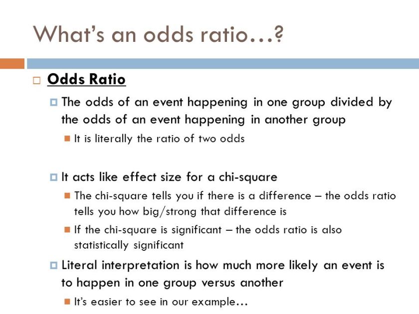 The odds of an event happening in one group divided by the odds of an event happening in another group. It is literally the ratio of two odds. It acts like effect size for a chi-square. The chi-square tells you if there is a difference – the odds ratio tells you how big/strong that difference is. If the chi-square is significant – the odds ratio is also statistically significant. Literal interpretation is how much more likely an event is to happen in one group versus another. It’s easier to see in our example…