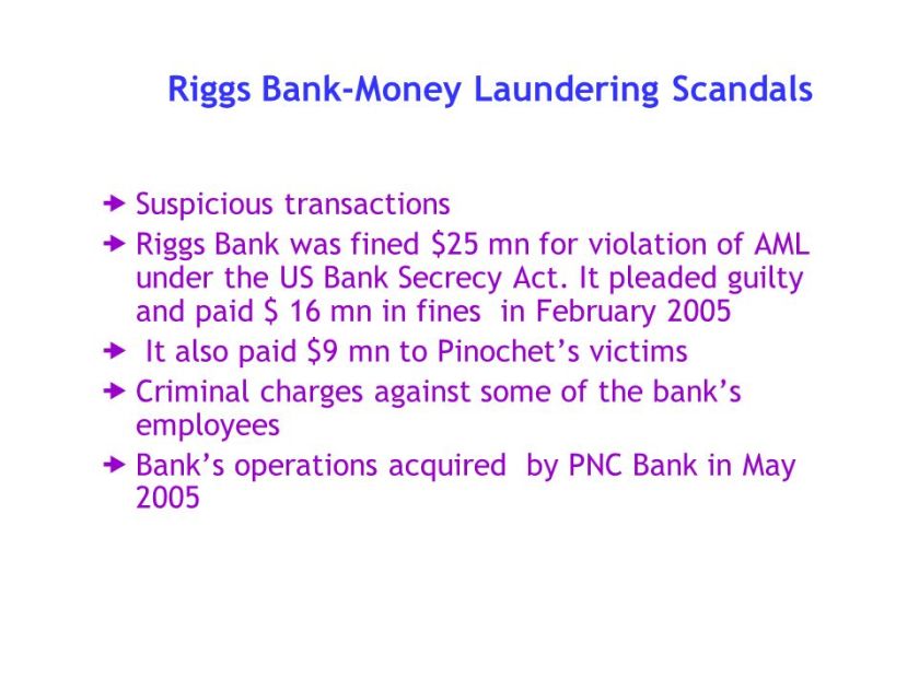 Suspicious transactions. Riggs Bank was fined 25 mn for violation of AML under the US Bank Secrecy Act. It pleaded guilty and paid 16 mn in fines in February It also paid 9 mn to Pinochet’s victims. Criminal charges against some of the bank’s employees. Bank’s operations acquired by PNC Bank in May 2005.